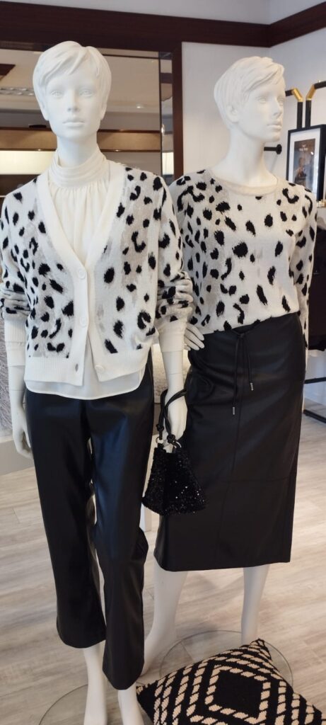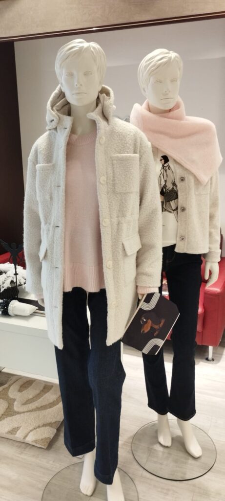 Links: Jacke 129,99€ | Bluse 79,99€ | Hose 119,99€ | Tasche 59,99€ Rechts: Pullover 119,99€ | Rock 99€